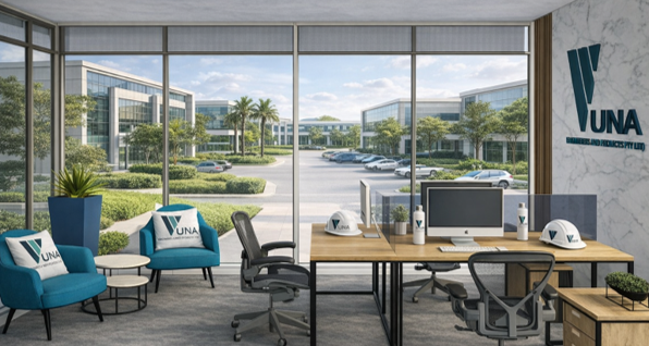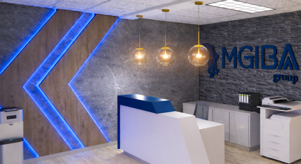A premium office project featuring a welcoming reception and collaborative work zones.