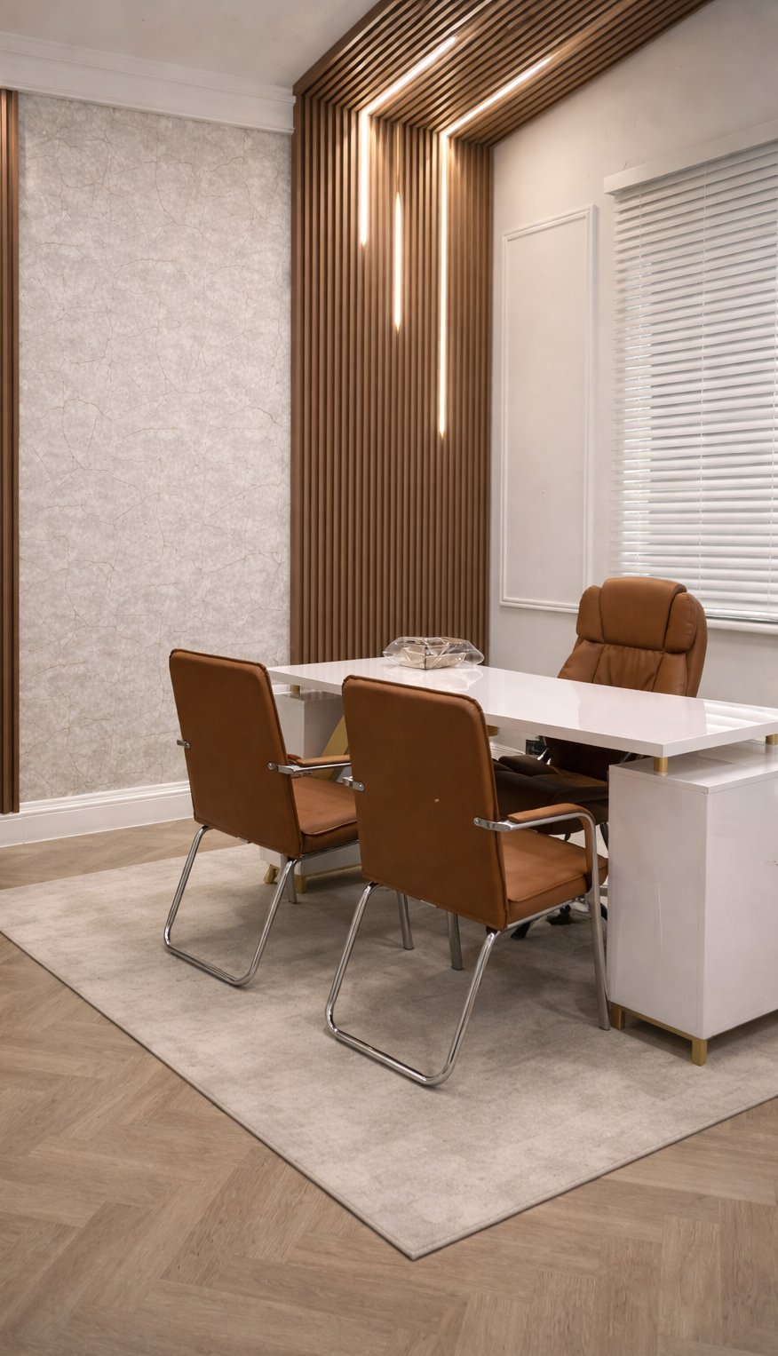 A consultation-driven office interior focused on privacy and client comfort.